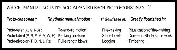 Thanks to the computerized spreadsheet, we now have the first collections of the modern descendants of the proto-consonant sounds used to coin vocabulary in three main venues of activity: fire-making rituals, stone work, and logging/timbering. (The third group will hopefully be put into book form before too much time passes:-)
